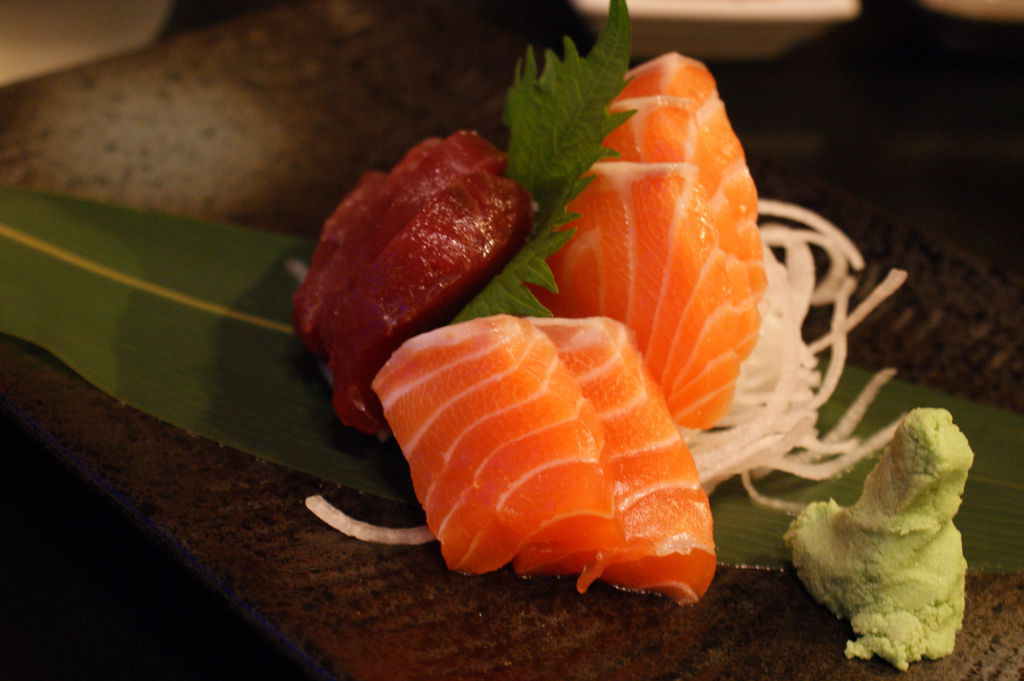 這是一份生魚片,有六片,口味我們選了鮭魚和鮪魚,好吃啊!有鮮才敢大!聲!(你在大聲什麼啦)