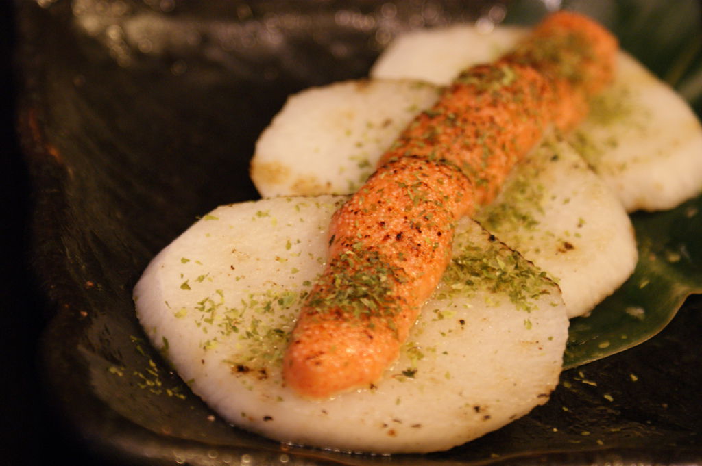 頗大的烤鯖魚(以價格來說很便宜),油脂不算多,邊邊有點乾,原味不會鹹,配著旁邊的蘿蔔泥吃很搭