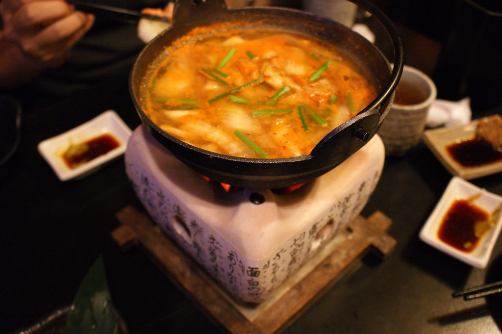 很可愛的小鍋,微辣的泡菜鍋,裡面還放了泡菜(廢話!)山藥還有沒幾塊的安康魚,深海安康魚?